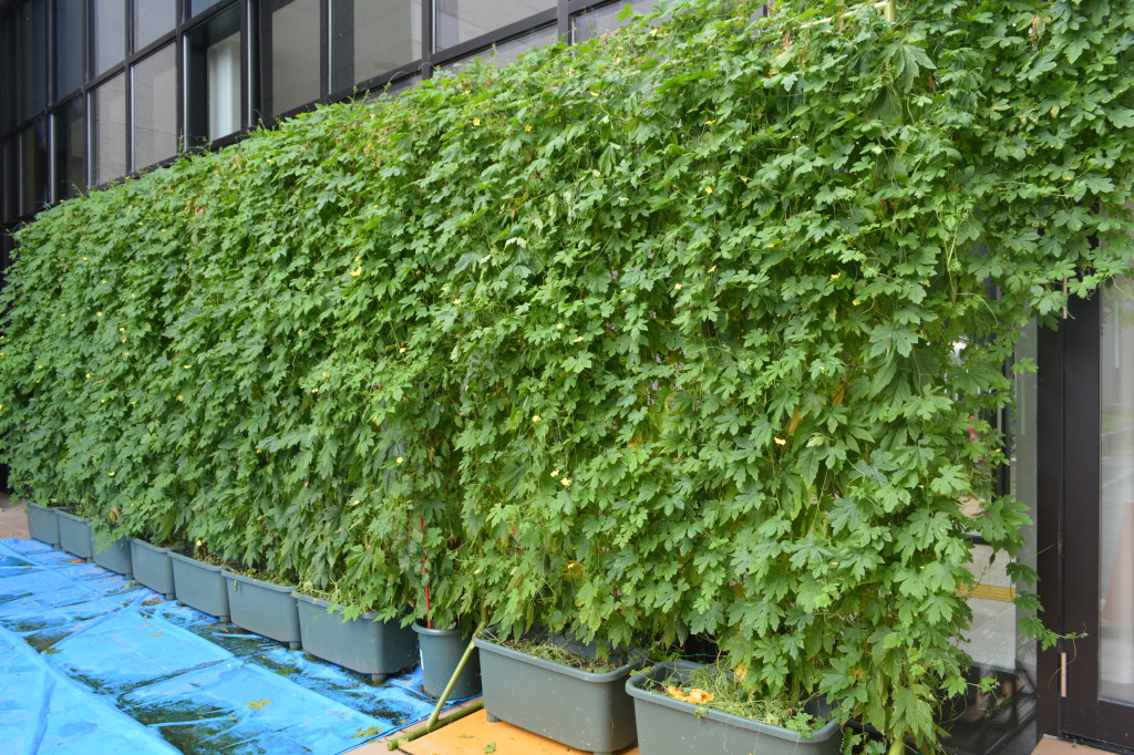 ここ、市役所にあるカーテンも夏の暑い時期には生い茂ったゴーヤの蔓が日陰を作り涼しくしてくれました。